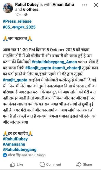 Ranchi: लातेहार के चंदवा में फायरिंग और बमबाजी की जिम्मेदारी राहुल दुबे गैंग ने लिया है. देर रात अपराधियों ने चंदवा साइडिंग टोरी में गोलीबारी और बमबारी को लेकर सोशल मीडिया पर पोस्ट किया गया है. जिसमे बताया गया है कि उस घटना की जिम्मेवारी राहुल दुबे अमन साहू लेता है. यह घटना सिर्फ रंजीत गुप्ता, सुमित चटर्जी तुम्हारे कान का पर्दा हटाने के लिए था, इसके पहले भी मेरे द्वारा तुम्हारे रंजीत गुप्ता साइडिंग में गोलीबारी करके तुम्हे चेतवानी दी गई थी फिर भी मेरी बात को तुमने नजरअंदाज किया ये घटना उसी का परिणाम है, अगर इस घटना के बावजूद भी आप लोगों को मेरी बात नहीं समझ आती है तो अगली बार ऑफिस और घर और गाड़ी पर बम फेंका जाएगा. क्योंकि यह सब जगह भी हम लोगों से छुपी हुई नहीं है अगर मेरी बातों और कारनामों का आप लोगों पर असर हो गया है तो अच्छी बात है अन्यथा अगला धमाका इससे भी दर्दनाक और जोरदार होगा. वही घटना की सूचना मिलने पर पुलिस पूरे मामले की जांच में जुट गई है.