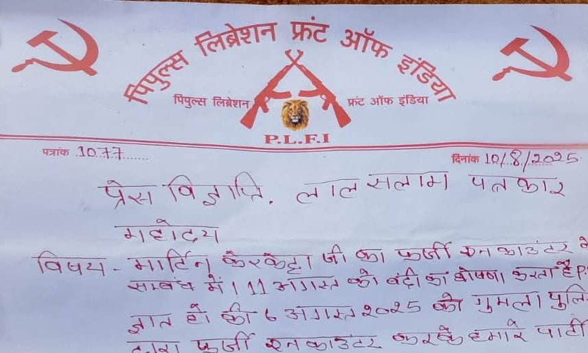 Ranchi: गुमला पुलिस के एनकाउंटर में ईनामी नक्सली मार्टिन केरकेट्टा के मारे जाने के बाद पीएलएफआई संगठन के सदस्य ने पुलिस पर सवाल उठाए है. कहा फर्जी एनकाउंटर कर मार्टिन केरकेट्टा मारा गया है. इसके विरोध में 11 तारीख को बंदी का घोषणा किया गया है. केंद्रीय कमेटी सदस्य अमृत होरो ने विज्ञप्ति जारी किया है.