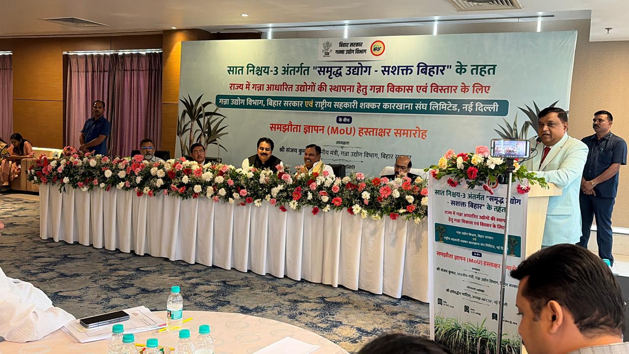 Patna: सात निश्चय-3 के तहत राज्य में गन्ना आधारित उद्योगों की स्थापना और गन्ना विकास एवं विस्तार के लिए सोमवार को एग्जीविशन रोड स्थित एक निजी होटल में समझौता ज्ञापन (एमओयू) पर हस्ताक्षर समारोह का आयोजन किया गया. गन्ना उद्योग मंत्री संजय कुमार की अध्यक्षता में आयोजित इस समारोह में संयुक्त ईखायुक्त जयप्रकाश नारायण सिंह और एनएफसीएसएफ के प्रबंध निदेशक प्रकाश नायकनावरे ने समझौता ज्ञापन पर हस्ताक्षर किए.