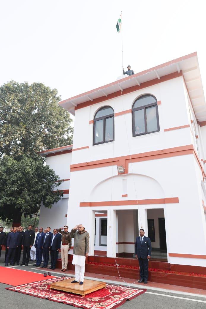 Patna: मुख्यमंत्री नीतीश कुमार रविवार को 76वें गणतंत्र दिवस के अवसर पर 1 अण्णे मार्ग स्थित आवास में झंडोत्तोलन किया. इस अवसर पर मुख्यमंत्री ने सशस्त्र टुकड़ियों की सलामी ली तथा सभी को गणतंत्र दिवस की शुभकामनायें दी. इस अवसर पर बच्चों को मुख्यमंत्री ने जलेबी खिलाई और उनके उज्ज्वल भविष्य की कामना की.