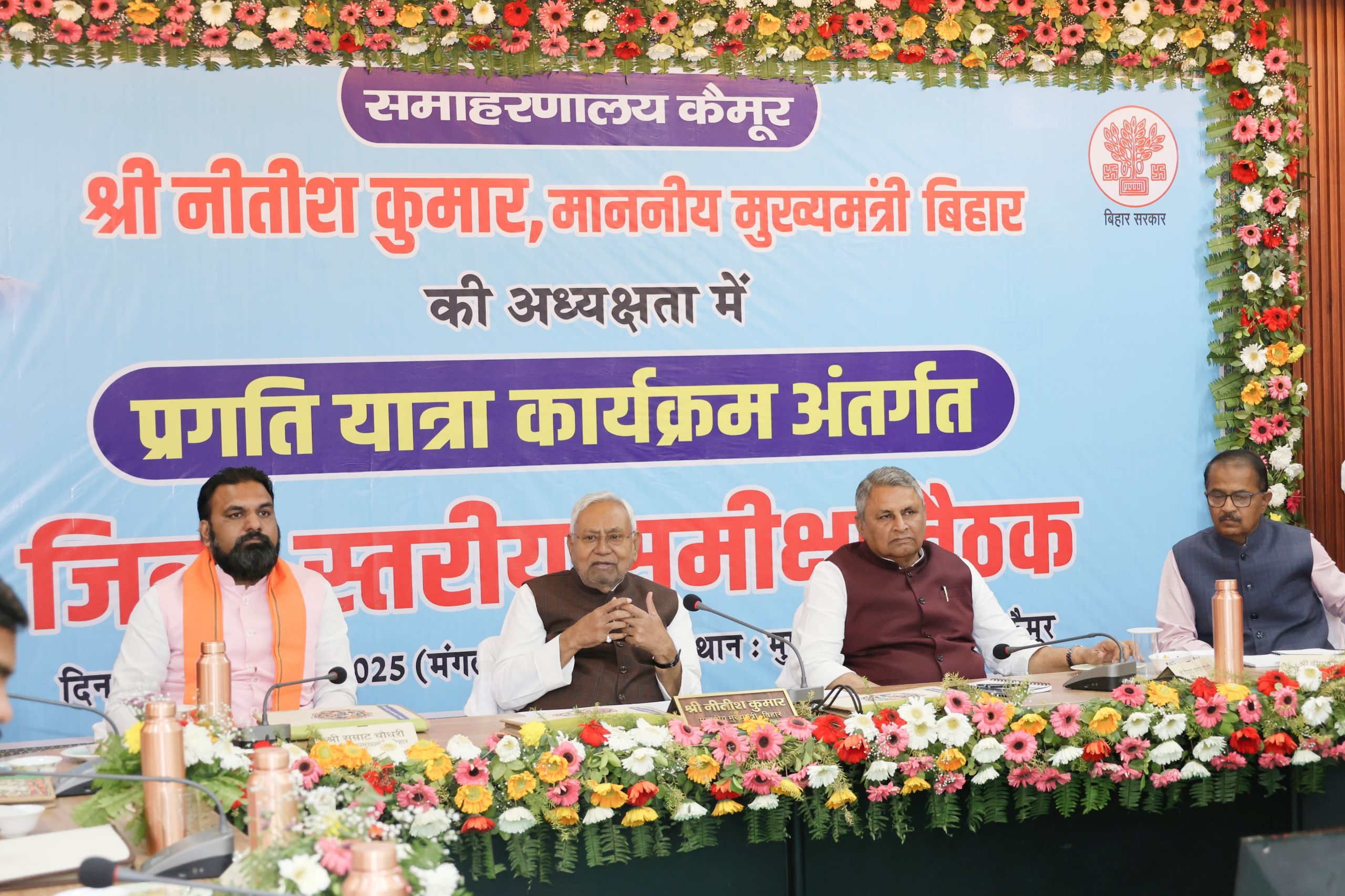 मुख्यमंत्री नीतीश कुमार मंगलवार को प्रगति यात्रा के क्रम में कैमूर जिला के नवनिर्मित बाजार समिति, मोडनिया परिसर से 345.50 करोड़ रुपये की कुल 169 विकासात्मक योजनाओं का रिमोट के माध्यम से उद्घाटन एवं शिलान्यास किया. इसमें 233.29 करोड़ रुपये की 79 योजनाओं का शिलान्यास और 112.20 करोड़ रुपये की 90 योजनाओं का उद्घाटन शामिल है. मोहनिया प्रखंड के ग्राम पंचायत भरखर में पंचायत सरकार भवन का रिमोट के माध्यम से उद्घाटन किया. जीविका दीदियों एंव विभिन्न विभागों द्वारा लगाए गए स्टॉल का मुख्यमंत्री ने अवलोकन किया. मुख्यमंत्री ने कृषि उत्पादन बाजार प्रांगण, मोहनियां के जीर्णोद्धार एवं निर्माण कार्य का रिमोट के माध्यम से उद्घाटन किया. अधौरा प्रखंड में प्रस्तावित डिग्री कॉलेज के निर्माण को लेकर चिन्हित स्थल का निरीक्षण किया. मुख्यमंत्री ने प्राथमिक स्वास्थ्य केंद्र एवं भवन निर्माण निगम द्वारा मुख्यमंत्री खेल विकास योजना के तहत अधौरा प्रखंड में निर्मित कराए गए फुटबॉल स्टेडियम का रिमोट के माध्यम से उद्घाटन कर निरीक्षण किया. प्रस्तावित सोन-कोहिरा नदी लिंक योजना का करकटगढ़ ईको पर्यटन क्षेत्र से स्थल निरीक्षण कर अधिकारियों को कई आवश्यक दिशा निर्देश दिये.