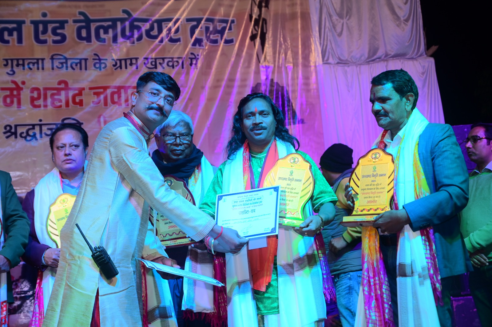 एक शाम शहीदों के नाम कार्यक्रम के आयोजन कर्ता “ Gumla Satya Charitable & welfare Trust” जिसके अध्यक्षा सत्या देवी, सचिव अंकिता तिवारी, उपाध्यक्ष शिल्पी तिवारी एवं कोषाध्यक्ष उज्जवल तिवारी के द्वारा न केलव वीर अमर शहीदों को श्रद्धांजलि अर्पित किया गया. बल्कि झारखण्ड के विभूतियों को भी सम्मानित किया गया. जिससे झारखण्ड की समृद्ध संस्कृति और परंपराओं को  प्रोत्साहित किया जा सके. इस कार्यक्रम में उक्त सभी सम्मानित व्यक्तियों के अतिरिक्त अभिषेक कुमार गौरव, असिस्टेंड कमांडेंट एसएसबी 32 बटा. अभिमन्यु कुमार, गुमला के परिचारी प्रवर तरूण कुमार, थाना प्रभारी घाघरा, परिचारी देवनीश बेक, गुमला थाना के एसआई अंकित राज, एवं गनमान्य व्यक्ति कृष्णदेव सिंह, मिसीर कुजूर, अमीत तिवारी, रूपेश गोप, मनोज बड़ाईक, दीपांकर साहु, युगांत दुबे, महेन्द्र सिंह तथा समस्त खरका ग्रामवासी उपस्थित थे.