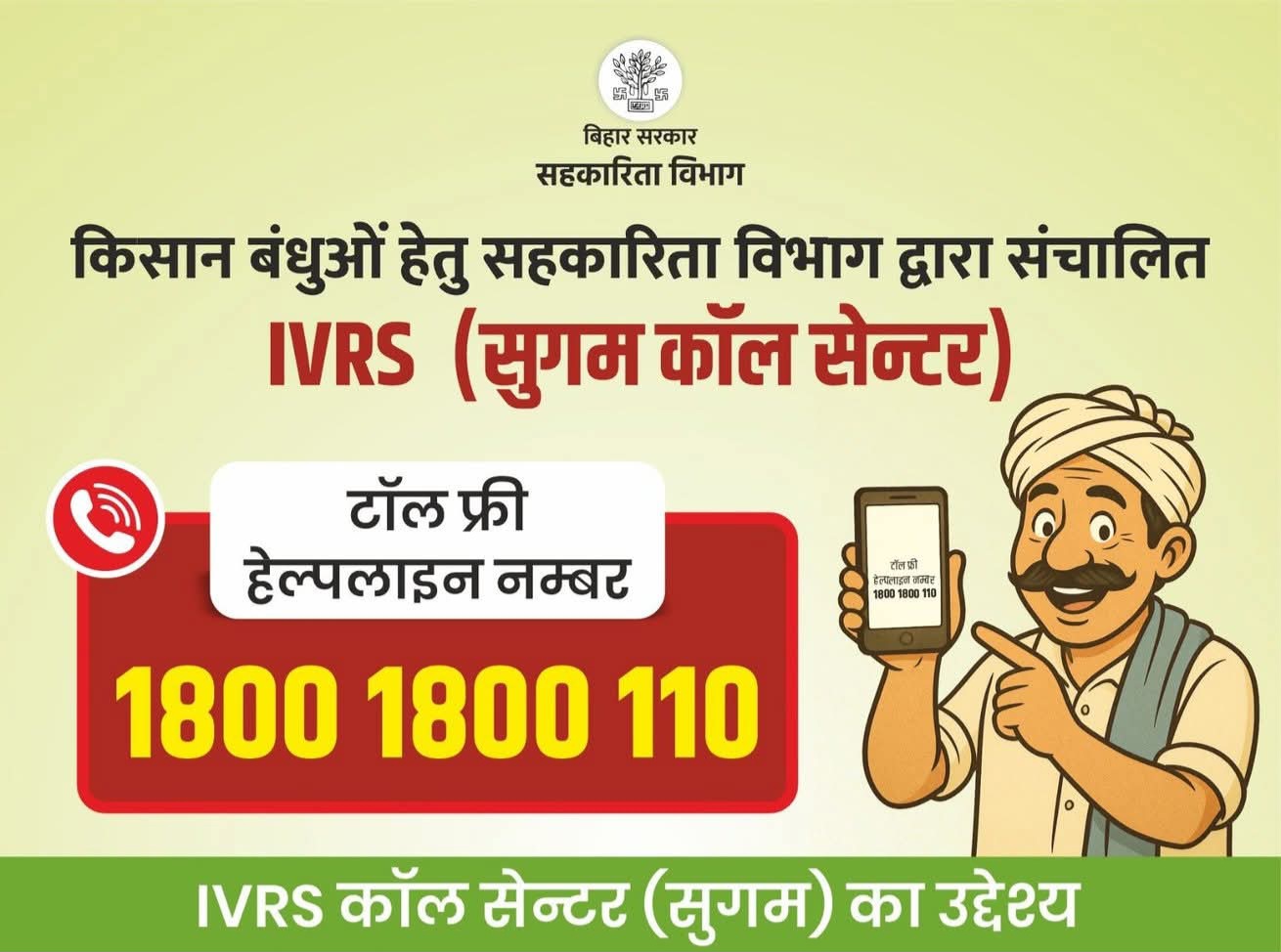 Patna: बिहार सरकार का सहकारिता विभाग किसानों की सुविधा और उनके कल्याण के लिए लगातार काम कर रहा है. विभाग का आईवीआरएस (इंटरैक्टिव वॉयस रिस्पॉन्स सिस्टम) कॉल सेंटर (सुगम कॉल सेंटर) हर दिन किसानों की मदद कर रहा है. यह किसानों को सहकारिता विभाग की विभिन्न योजनाओं की जानकारी देता है. सुगम कॉल सेंटर किसानों को योजनाओं की जानकारियां देने के साथ ही उनकी समस्याओं का समाधान भी कर रहा है. विभाग ने इस कॉल सेंटर के लिए मुफ्त टॉल-फ्री हेल्पलाइन नंबर 18001800110 जारी किया है, जिसके माध्य से सेवाएं प्रदान की जाती हैं.