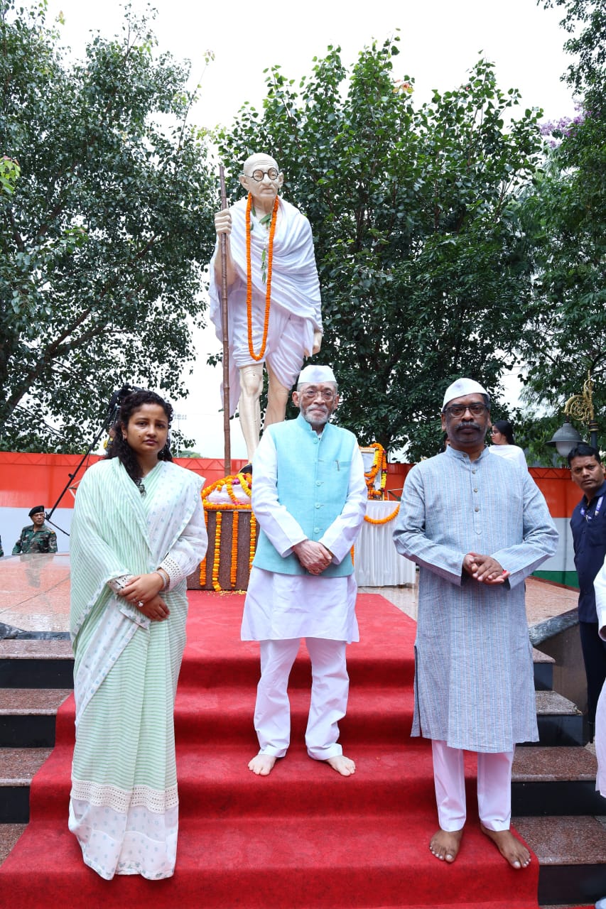 Ranchi: गांधी जयंती के अवसर पर गुरुवार राज्यपाल संतोष कुमार गंगवार, मुख्यमंत्री हेमन्त सोरेन एवं विधायक कल्पना सोरेन ने मोरहाबादी स्थित बापू वाटिका में राष्ट्रपिता महात्मा गांधी की प्रतिमा पर माल्यार्पण कर श्रद्धा सुमन अर्पित किया. इस अवसर पर मुख्यमंत्री हेमन्त सोरेन ने कहा कि महात्मा गांधी के विचार, उनकी अहिंसा एवं सत्य की राह पर चलने की प्रेरणा आज भी पूरे देश और विश्व के लिए मार्गदर्शक है.