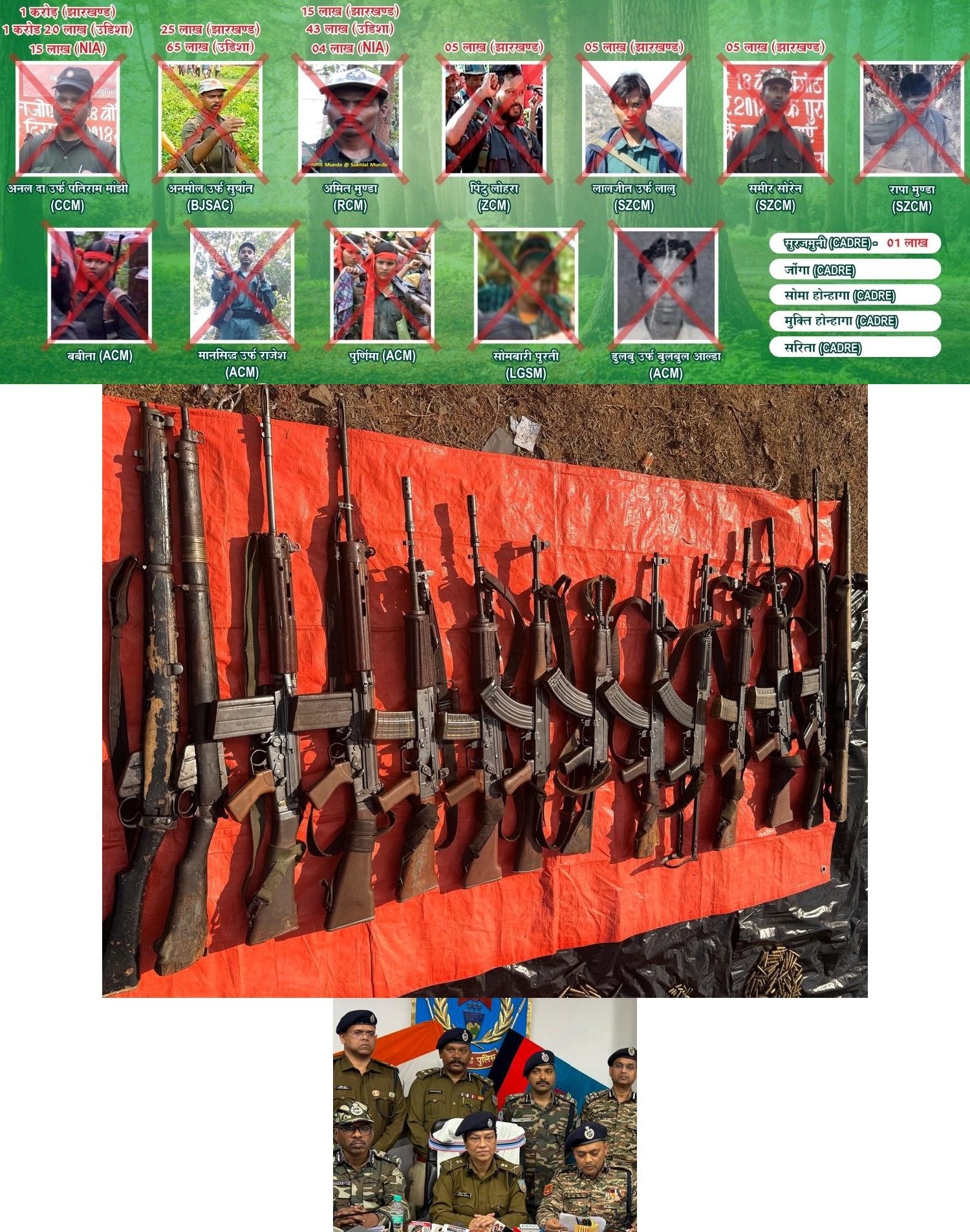 मृत नक्सलियों में गिरीडिह जिले के पीरटांड थाना क्षेत्र के झरहा निवासी अनल उर्फ पतिराम मांझी, बोकारो जिले के नावाडीह थाना क्षेत्र के बंसी टोला निवासी, रांची जिले के तमाड़ थाना क्षेत्र के तमराना निवासी अमित मुण्डा, सोनाहातू थाना क्षेत्र के बारीसालडीह निवासी पिन्टु लोहरा, चाईबासा जिले के किरीबुरु थाना क्षेत्र के धारणादिरी निवासी लालजीत उर्फ लालु, तांतनगर थाना क्षेत्र के ईलीगढ़ा निवासी बुलबुल अलदा, गोईलकेरा थाना क्षेत्र के ईचागोड़ा निवासी पुर्णिमा, बोईपाई ससांग निवासी जोंगा, खूंटी जिले क अड़की थाना क्षेत्र के माईलपिड़ी निवासी राजेश मुंडा, सरायकेला जिले के कुचाई थाना क्षेत्र के कोरर्रा निवासी बबिता, सुरजमुनी, चाईबासा जिले के गोईलकेरा थाना क्षेत्र के बोईपाई सरसंग निवासी जोगा, कसीजात निवासी सोमबारी पूर्ति, सोमा होनहागा, मुक्ति होनहागा और सरिता का नाम शामिल है.