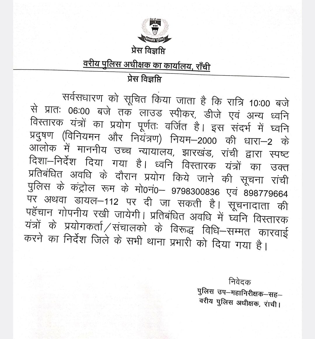 Ranchi: राजधानी रांची में रात 10 बजे से सुबह 6 बजे तक डीजे, लाउड स्पीकर बजाना वर्जित रहेगा. प्रतिबंध अवधि में प्रयोग करने पर पुलिस को सूचना देने पर कार्रवाई की जायेगी. रांची एसएसपी ने इसको लेकर विज्ञप्ति जारी किया है. जारी विज्ञप्ति के अनुसार सर्वसधारण को सूचित किया जाता है कि रात्रि 10:00 बजे से प्रातः 06:00 बजे तक लाउड स्पीकर, डीजे एवं अन्य ध्वनि विस्तारक यंत्रों का प्रयोग पूर्णतः वर्जित है. इस संदर्भ में घ्वनि प्रदुषण (विनियमन और नियंत्रण) नियम-2000 की धारा-2 के आलोक में उच्च न्यायालय द्वारा स्पष्ट दिशा-निर्देश दिया गया है. ध्वनि विस्तारक यंत्रों का उक्त प्रतिबंधित अवधि के दौरान प्रयोग किये जाने की सूचना राँची पुलिस के कंट्रोल रूम के मो0नं0- 9798300836 एवं 898779664 पर अथवा डायल-112 पर दी जा सकती है. सूचनादाता की पहचान गोपनीय रखी जायेगी. प्रतिबंधित अवधि में घ्वनि विस्तारक यंत्रों के प्रयोगकर्ता, संचालको के विरूद्ध विधि-सम्मत कारवाई करने का निर्देश जिले के सभी थाना प्रभारी को दिया गया है.