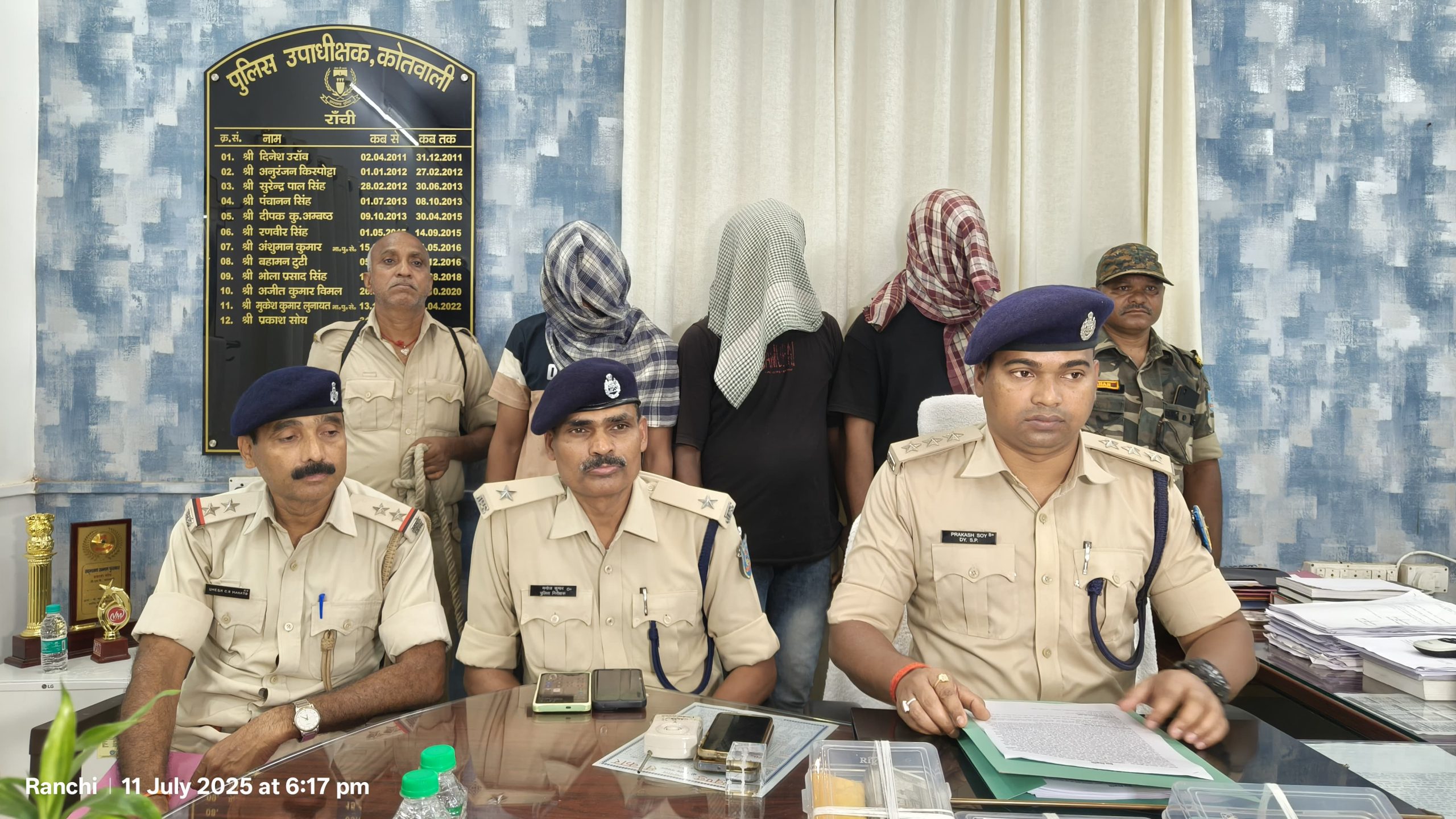पुलिस के अनुसार एसएसपी को गुप्त सूचना मिली कि सुखदेवनगर थाना क्षेत्र के गंगा नगर रोड नंबर 01 नदी पार मोहिनी देवी अपने किराये के घर पर अवैध रूप से मादक पदार्थ की खरीद बिक्री करती है. सूचना पर कोतवाली डीएसपी के नेतृत्व में एक टीम का गठन किया गया. गठित छापामारी टीम मोहिनी शर्मा उर्फ मोहिनी देवी के पास पहुंचकर छापामारी कर मोहिनी शर्मा को पकडा गया. घर की तलाशी के क्रम में कमरे से 50 पुडिया ब्राउन शुगर बरामद किया गया. उसकी निशानदेही पर पहाड़ी मंदिर के पीछे, पानी टकी के पास से सुमित तिर्की, पारस कुमार उर्फ गोलु, मो0 इस्माईल को पकड़ा गया. साथ ही एक निरुद्ध किशोर को पकड़ा गया. सुमित तिर्की के पास से ब्राउन शुगर, 40,950 रुपया, पारस कुमार उर्फ गोलु के पास से ब्राउन शुगर, 12,400 रुपया, बाइक, मो० इस्माईल के पास से ब्राउन शुगर, मोबाइल, 6290 रुपया एवं निरुद्ध किशोर के पास से 2 पुडिया ब्राउन शुगर, मोबाइल, 4000 रुपया बरामद किया गया. इस सदर्भ में सुखदेवनगर थाना (कांड संख्या:- 359/25) में मामला दर्ज किया गया है.