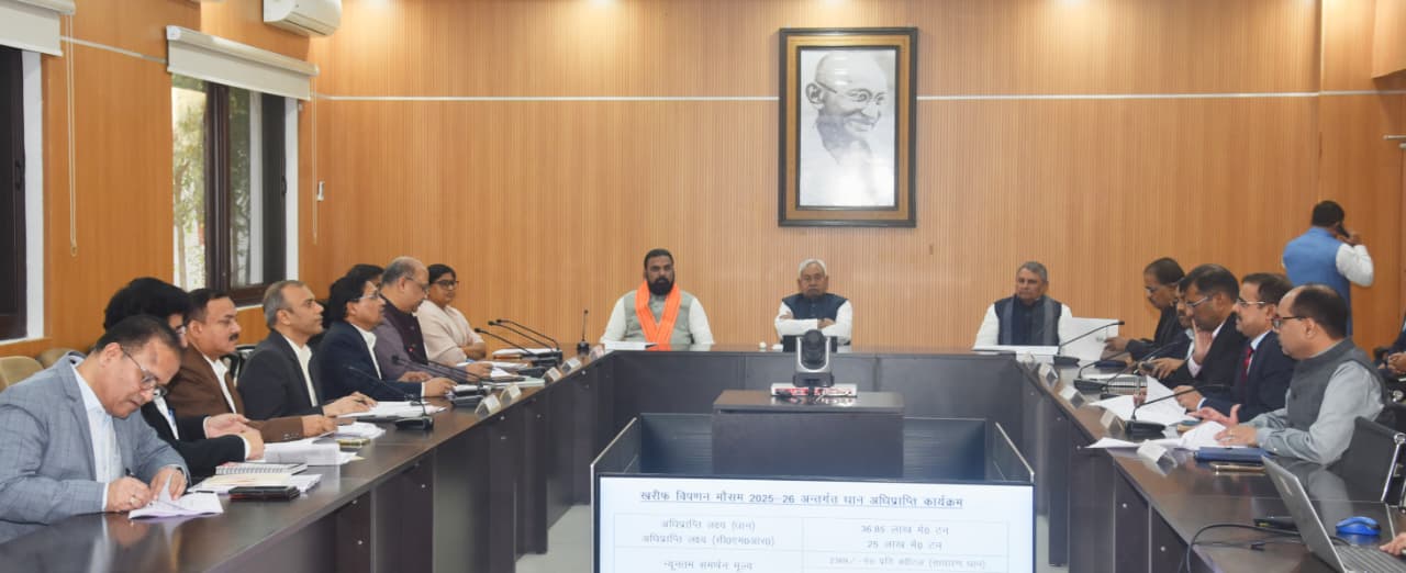 Patna: मुख्यमंत्री नीतीश कुमार ने 1 अणे मार्ग स्थित ‘संकल्प’ में खरीफ विपणन वर्ष 2025-26 में धान अधिप्राप्ति की हाईलेवल समीक्षा बैठक की और अधिकारियों को आवश्यक निर्देश दिए. बैठक में खाद्य एवं उपभोक्ता संरक्षण विभाग के प्रधान सचिव पंकज कुमार ने प्रस्तुतीकरण के माध्यम से खरीफ विपणन वर्ष 2025-26 के अन्तर्गत धान का न्यूनतम समर्थन मूल्य, धान अधिप्राप्ति की प्रस्तावित अवधि एवं धान अधिप्राप्ति के लक्ष्य के संबंध में विस्तृत जानकारी दी. उन्होंने बताया कि इस बार सामान्य ग्रेड के धान का न्यूनतम समर्थन मूल्य 2369 रुपये प्रति क्विंटल रखा गया है, जबकि धान ग्रेड ए का न्यूनतम समर्थन मूल्य 2389 रूपये रखा गया है. धान अधिप्राप्ति की अवधि 1 नवंबर 2025 से 28 फरवरी 2026 तक रखा गया है. चरणबद्ध तरीके से धान अधिप्राप्ति की प्रक्रिया शुरू की गई है और इस वर्ष धान अधिप्राप्ति का लक्ष्य 36.85 लाख मीट्रिक टन रखा गया है. राज्य में उसना चावल मिलों की संख्या अब बढ़कर 396 हो गई है. उन्होंने बताया कि सभी जिलो में धान अधिप्राप्ति शुरू कर दिया गया है.