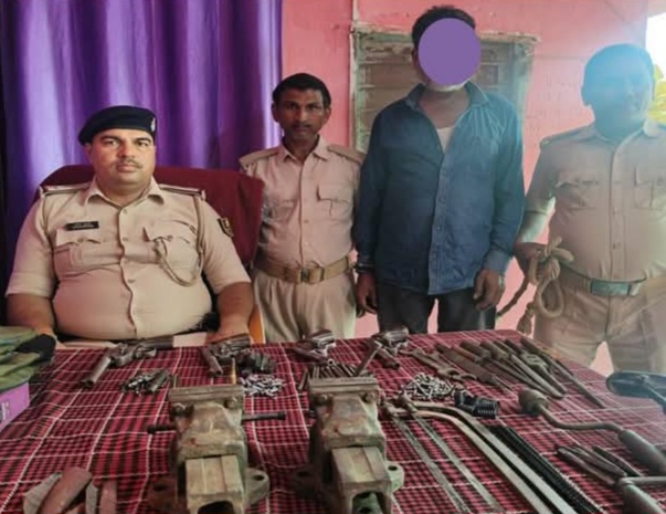 जानकरी के मुताबिक बीते संध्या रूस्तमपुर थाना पुलिस को विशेष छापेमारी के क्रम में गुप्त सूचना मिली कि परिसोतीमपुर गांव स्थित गंगा नदी के किनारे झाड़ी में कुछ लोग अवैध देशी कट्टा बनाता है. सूचना पर रूस्तमपुर थाना पुलिस मौके पर पहुँची तो झाड़ियो से निकलकर दो लोग भागने लगे. भागने के क्रम में सुरेश कुमार को पकड़ा गे. वजी एक आरोपी फरार हो गया. तलाशी के क्रम झाड़ियो से एक बैग से 4 देशी कट्टा एवं एक प्लास्टिक के बोरा से गोली एवं हथियार बनाने का उपकरण बरामद किया गया. इस संदर्भ में रूस्तमपुर थाना (कांड सं0-140/25) में मामला दर्ज किया गया है. वही फरार आरोपी की पहचान कर ली गई है. जिसकी गिरफ्तारी के लिए लगातार छापेमारी की जा रही है.