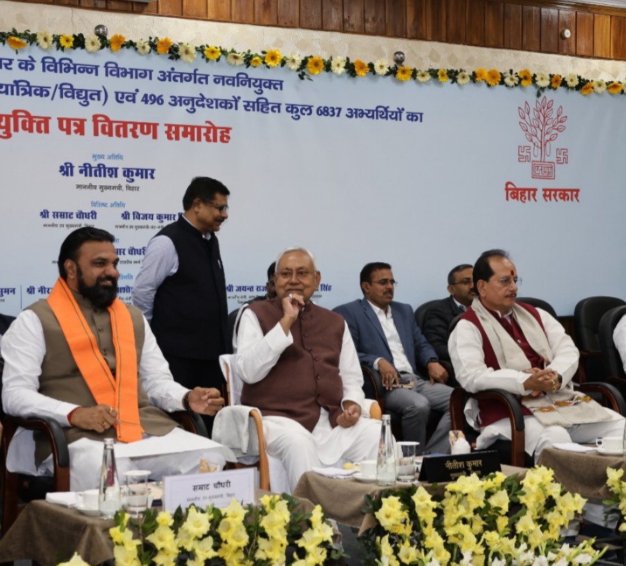 Patna: मुख्यमंत्री नीतीश कुमार सोमवार को 6,837 नवनियुक्त कनीय अभियंताओं एवं अनुदेशकों के नियुक्ति पत्र वितरण समारोह में शामिल हुए. मुख्यमंत्री सचिवालय स्थित ‘संवाद’ में आयोजित समारोह में मुख्यमंत्री ने अभ्यर्थियों को नियुक्ति पत्र प्रदान किया. नियुक्ति पत्र वितरण समारोह के माध्यम से मंगलवार को विभिन्न विभागों के अंतर्गत नवनियुक्त 6,341 कनीय अभियंताओं एवं श्रम संसाधन विभाग के अंतर्गत 496 अनुदेशकों को नियुक्ति पत्र प्रदान किया गया. समारोह को संबोधित करते हुए मुख्यमंत्री ने कहा कि बहुत खुशी की बात है कि आज इस नियुक्ति पत्र वितरण समारोह के माध्यम से विभिन्न विभागों द्वारा चयनित 6,837 नवनियुक्त कनीय अभियंताओं एवं अनुदेशकों को नियुक्ति पत्र प्रदान किया जा रहा है. नवनियुक्त 6,341 कनीय अभियंताओं में जल संसाधन विभाग के द्वारा नवचयनित 2,338 अभ्यर्थियों, योजना एवं विकास विभाग अंतर्गत नवचयनित 1273 अभ्यर्थियों, ग्रामीण कार्य विभाग अंतर्गत नवचयनित 759 अभ्यर्थियों, पथ निर्माण विभाग के द्वारा नवचयनित 530 अभ्यर्थियों लघु जल संसाधन विभाग अंतर्गत नवचयनित 484 अभ्यर्थियों, लोक स्वास्थ्य अभियंत्रण विभाग अंतर्गत नवचयनित 478 अभ्यर्थियों, भवन निर्माण विभाग अंतर्गत नवचयनित 430 अभ्यर्थियों तथा नगर विकास एवं आवास विभाग के माध्यम से नवचयनित 49 अभ्यर्थियों को नियुक्ति पत्र प्रदान किया जा रहा है. मैं उन सभी विभागों को धन्यवाद देता हूं, जिनके द्वारा आप सभी अभ्यर्थियों का चयन किया गया है.