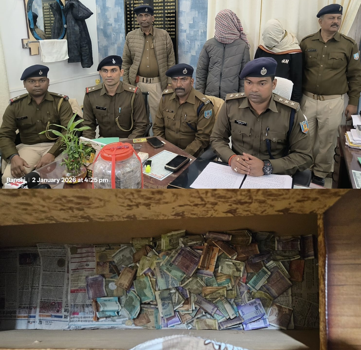 मामले की जानकारी देते हुए कोतवाली डीएसपी ने बताया कि बीते रात करीब 22:46 बजे एसएसपी को गुप्त सूचना मिला कि सुखदेवनगर थाना क्षेत्र के मधुकम रूगढ़ीगड़ा के पास जुतून लिण्डा के द्वारा घर में अवैध मादक पदार्थ (गंजा) का खरीद-बिक्री किया जा रहा है. सूचना कोतवाली डीएसपी के नेतृत्व में एक टीम का गठन किया गया. गठित टीम नूतन लिण्डा के मधुकम रूगड़गड़ा स्थित घर पहुँचकर घेराबंदी किया गया. इसी क्रम में पुलिस को देखकर कुछ संदिग्ध पीछे बाउण्ड्री वाल के तरफ से भागने लगा. भागने के दौरान नुतून लिण्डा उर्फ मिथुन और अमन जायसवाल को पकड़ा गया. ननकु लिण्डा उर्फ मिथुन के घर का तलाशी में 1.052 किग्रा गांजा एवं पलंग के नीचे बॉक्स में गंजा ब्रिकी का 2,71,000 रूपया नगद बरामद किया गया. पूछताछ करने पर आरोपी ने बताया कि गंजा का खरीद बिक्री का मुख्य सरगना नन्हकु लिण्डा के द्वारा बाहर से लाकर उन दोनों से पुडिया बनाकर लोगों को बेचने का काम करवाता है. पुलिस को देखकर पीछे बाउण्ड्रीवाल के तरफ से अन्धेरा का फायदा उठाकर भाग गया है. और बरामद पैसा के बारे में बताया कि ये गंजा बिकी का पैसा है. इस संबंध में सुखेदवनगर थाना (काण्ड सं0-1/26) में मामला दर्ज किया गया है. नुतून लिण्डा उर्फ मिथुन औऱ अमन जायसवाल अपराधिक इतिहास रहा है. दोनो आरोपी के विरुद्ध सुखदेवनगर थाना में तीन मामला दर्ज है.