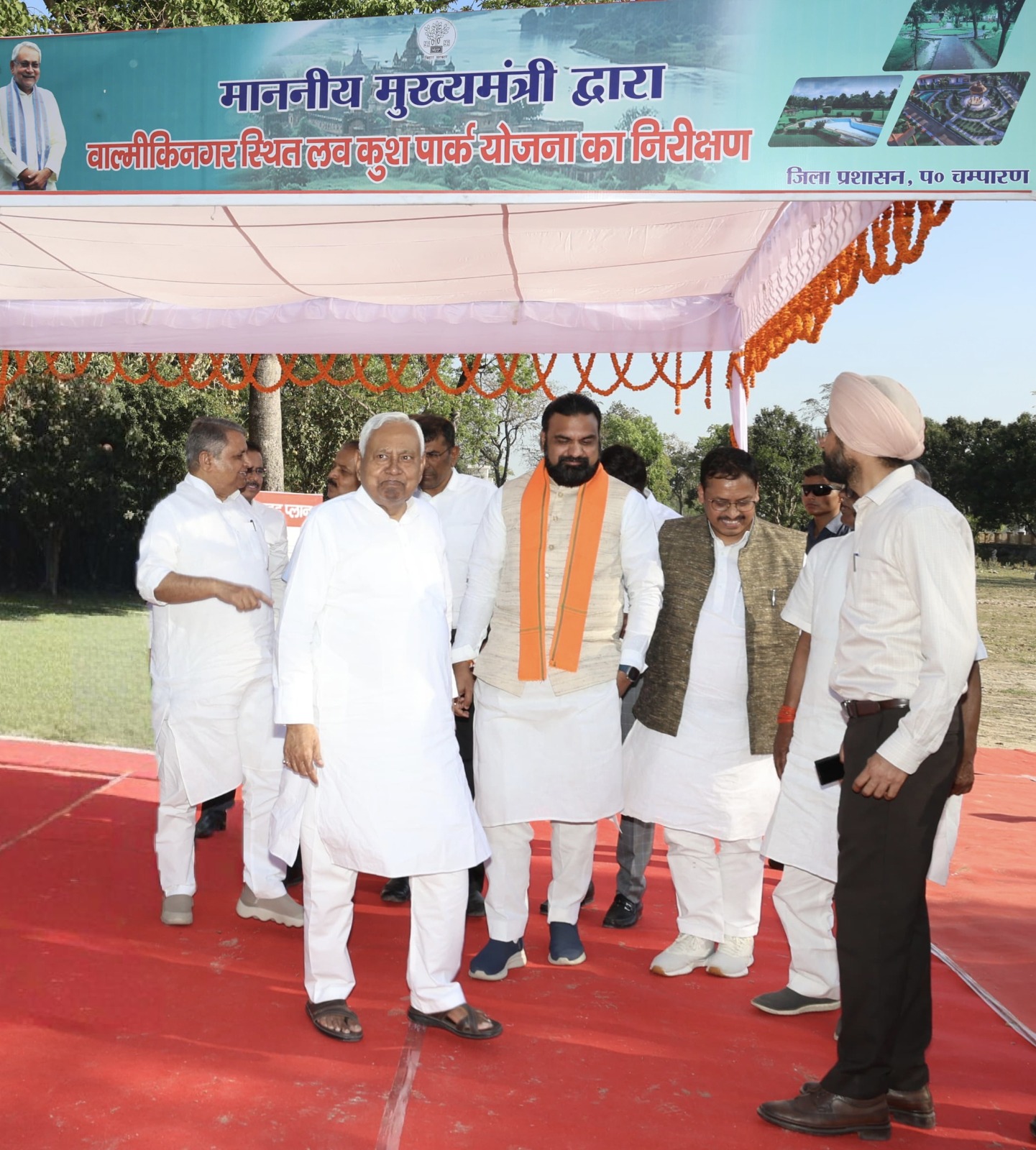 मुख्यमंत्री ने गंडक बांध जलाशय के सामने लव-कुश ईको टुरिज्म पार्क के निर्माण कार्य का जायजा लिया और वहां उपलब्ध करायी जा रही सुविधाओं की जानकारी ली. साइट प्लान के माध्यम से अधिकारियों ने लव-कुश ईको टुरिज्म पार्क में निर्माण कराये जा रहे विभिन्न भागों के संबंध में मुख्यमंत्री को जानकारी दी. मुख्यमंत्री ने जल संसाधन विभाग के अतिथि भवन तथा वाल्मीकिनगर ईको पार्क का भी भ्रमण किया. मुख्यमंत्री ने गंडक बराज पहुंचकर वहां की स्थिति का जायजा लिया.